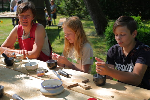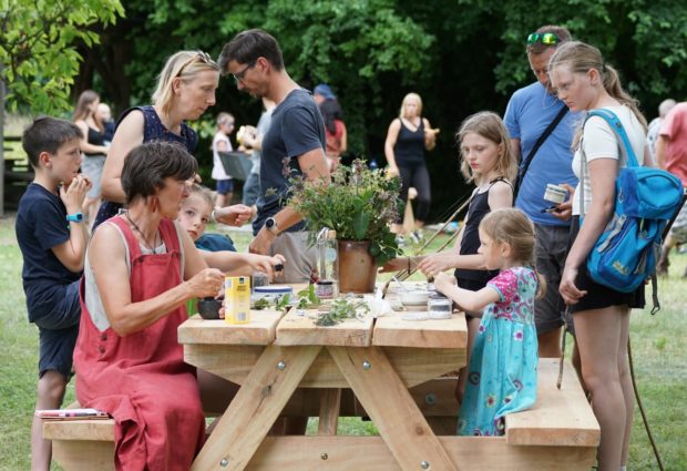 An einem anderen Stand wurde aus vielen verschiedenen Blüten und Kräutern aller Couleur Kräutersalz hergestellt. Farblich abgestimmt in kleine Gläser gefüllt, entstanden lauter kleine Kunstwerke – zum Gebrauch fast zu schade! Und wer die eigene Schönheit unterstreichen wollte, dem standen am Schmuckstand allerhand natürliche Materialien zum Basteln von Stirn- und Armbändern Ketten u.ä. zur Verfügung. Auch Jäger und Falkner Reinhardt Eggert war mit einem großen und einem kleineren Falken vor Ort. Eindrucksvoll demonstrierte er, wie Mensch und Tier – ist der Bezug erst einmal aufgebaut – als gemeinsames Jäger-Team sehr erfolgreich Beute schlagen können. Zudem eroberten drei kleine Falken, die aus dem Nest gefallen waren und jetzt den Schutz einer luftigen Kiste genossen, die Herzen der Besucher.