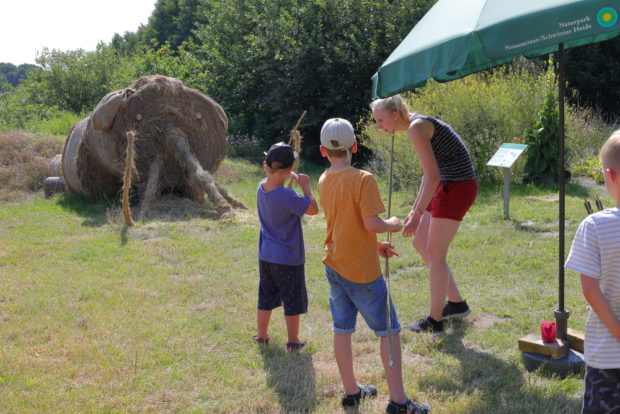 Alles, was an den verschiedenen Stationen hergestellt wurde, konnte direkt und nachvollziehbar vor Ort genutzt werden. So wurde z.B. das eigenhändig gemahlene Getreide in einen Teig eingearbeitet, anschließend um einen langen Stock gewickelt, über dem Feuer gebacken und als Knüppelbrot mit großem Appetit verspeist. Wer unter fachmännischer Leitung Pfeil und Bogen gebaut hatte, konnte die Treffsicherheit an einem Stroh-Mammut unter Beweis stellen. Ranger Rüdiger Sitte aus dem Nachbar-Naturpark Mecklenburgische Schweiz und Kummerower See war neben Fellen, Knochen und Geweihen mit Körben voller selbst gesammelter Feuersteine angereist, aus denen Schneideklingen hergestellt werden konnten. In Holzgriffe eingesetzt, dienten sie je nach Schärfe als Messer bzw. Werkzeug zur Bearbeitung von Tierhäuten.