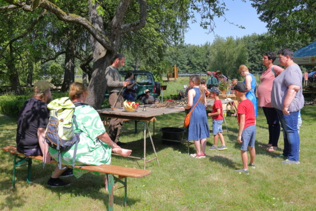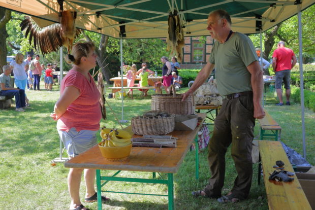 Wem das Knüppelbrot als kulinarisches Highlight nicht ausreichte, konnte auf ein breites Angebot von Kuchen – alle selbstgebacken – und regionalen Spezialitäten wie beispielsweise Wildschweinfrikadellen ausweichen. Auch an den diversen Obstkörben konnten sich Besucher bedienen. Die nämlich wurden, wie schon seit einiger Zeit, vom Edeka-Markt in Malchow gespendet. „Und vieles davon in Bio-Qualität“, freute sich Evelin Kartheuser, auch zuständig für Presse- und Öffentlichkeitsarbeit, und fügte auf die an den Ständen aufgestellten Boxen verweisend hinzu: „Fast alles hier läuft auf Spendenbasis. Das hat sich bewährt.“ Ob es im nächsten Jahr wieder ein Steinzeitfest geben wird oder ein anderes Thema gewählt wird, wird noch nicht verraten.