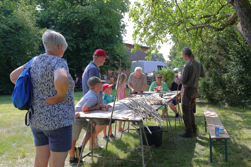 Alles, was an den verschiedenen Stationen hergestellt wurde, konnte direkt und nachvollziehbar vor Ort genutzt werden. So wurde z.B. das eigenhändig gemahlene Getreide in einen Teig eingearbeitet, anschließend um einen langen Stock gewickelt, über dem Feuer gebacken und als Knüppelbrot mit großem Appetit verspeist. Wer unter fachmännischer Leitung Pfeil und Bogen gebaut hatte, konnte die Treffsicherheit an einem Stroh-Mammut unter Beweis stellen. Ranger Rüdiger Sitte aus dem Nachbar-Naturpark Mecklenburgische Schweiz und Kummerower See war neben Fellen, Knochen und Geweihen mit Körben voller selbst gesammelter Feuersteine angereist, aus denen Schneideklingen hergestellt werden konnten. In Holzgriffe eingesetzt, dienten sie je nach Schärfe als Messer bzw. Werkzeug zur Bearbeitung von Tierhäuten.