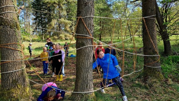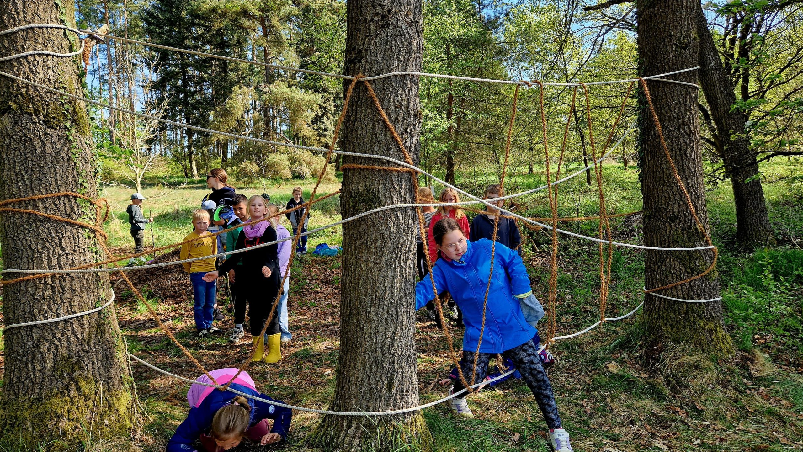 Hilfe, bloß nicht die klebrigen Spinnfäden berühren! Hier versuchen Schülerinnen, durch das Netz zu kommen. Foto: Schule Krakow