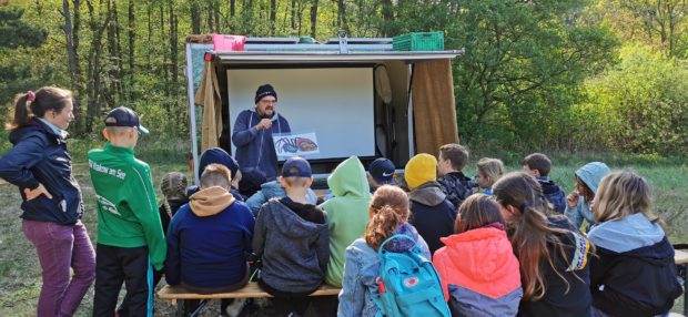 Der Körperbau der Spinne von außen und innen: Projektmitarbeiter Martin Post-Stapelfeldt erläutert spannende Details. Immer mit dabei: unser Umweltmobil. Hier konnten wir noch einen kleinen Film zeigen. Foto: E. Kartheuser