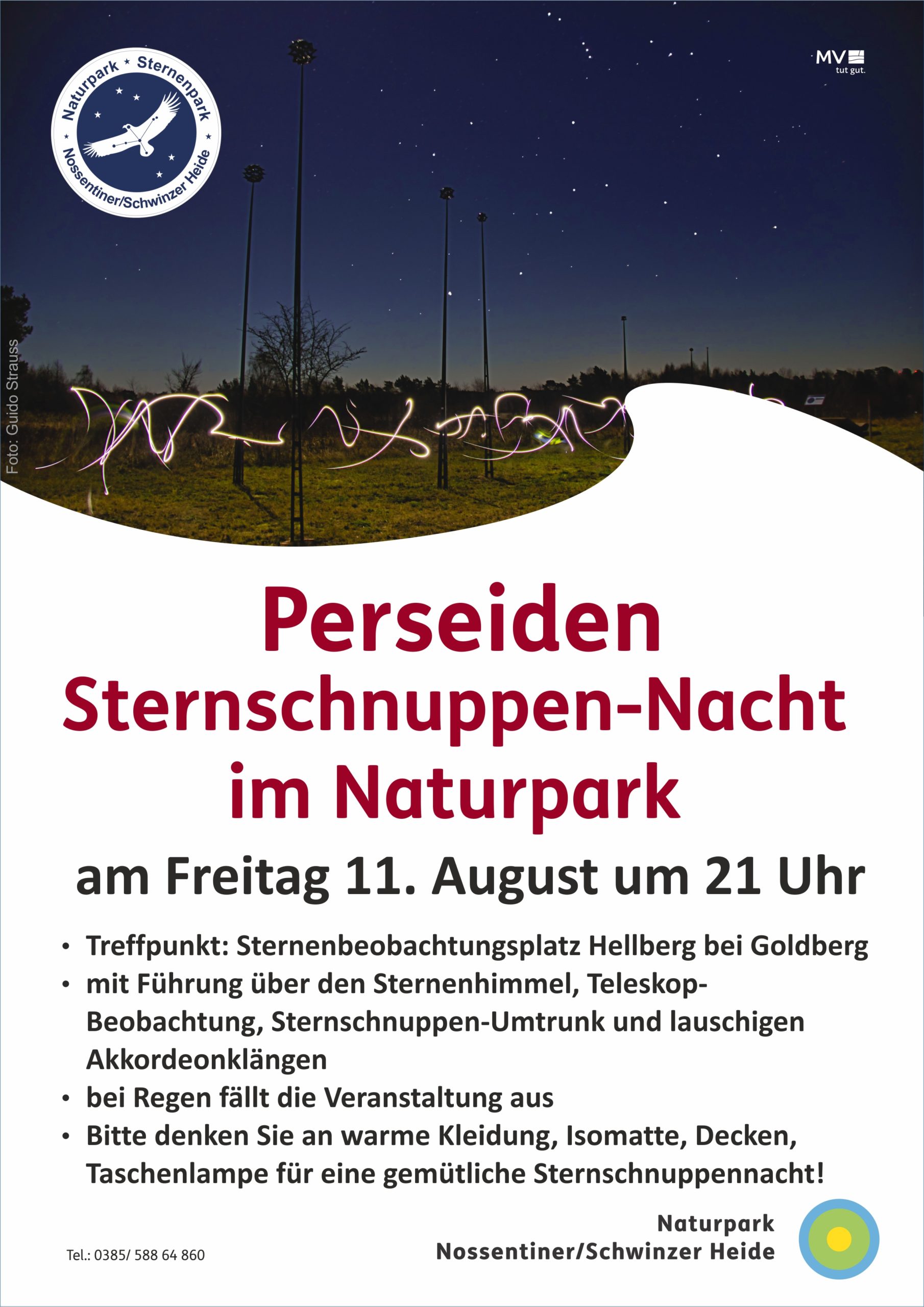 Karow/Goldberg. Im August werden die Tage wieder kürzer. Doch dies hat auch sein Gutes: so kann man wieder Sternschnuppen beobachten. Sternschnuppen, wissenschaftlich als Meteore bezeichnet, sind Gesteins- und Staubteilchen, die in der Hochatmosphäre verglühen. Der bekannteste Meteorstrom sind die Perseiden. Jedes Jahr um den 12. August kreuzt die Erde auf ihrem Weg um die Sonne die Umlaufbahn der Teilchen dieses Stroms. Aus diesem Anlass lädt der Naturpark Nossentiner/Schwinzer Heide am Freitag, 11. August 2023, zu einer Nachtführung ein. Astronomielehrer und Sternenkenner Torsten Degen wird Wissenswertes zu den Perseiden und anderen Himmelsobjekten vermitteln und uns dabei „über den Himmel führen“. Auch ein Teleskop wird zur Verfügung stehen. Bei lauschigen Akkordeonklängen und einem leckeren Getränk kann dann in den Himmel geschaut werden. Warme Kleidung, Isomatten und Decken nicht vergessen!