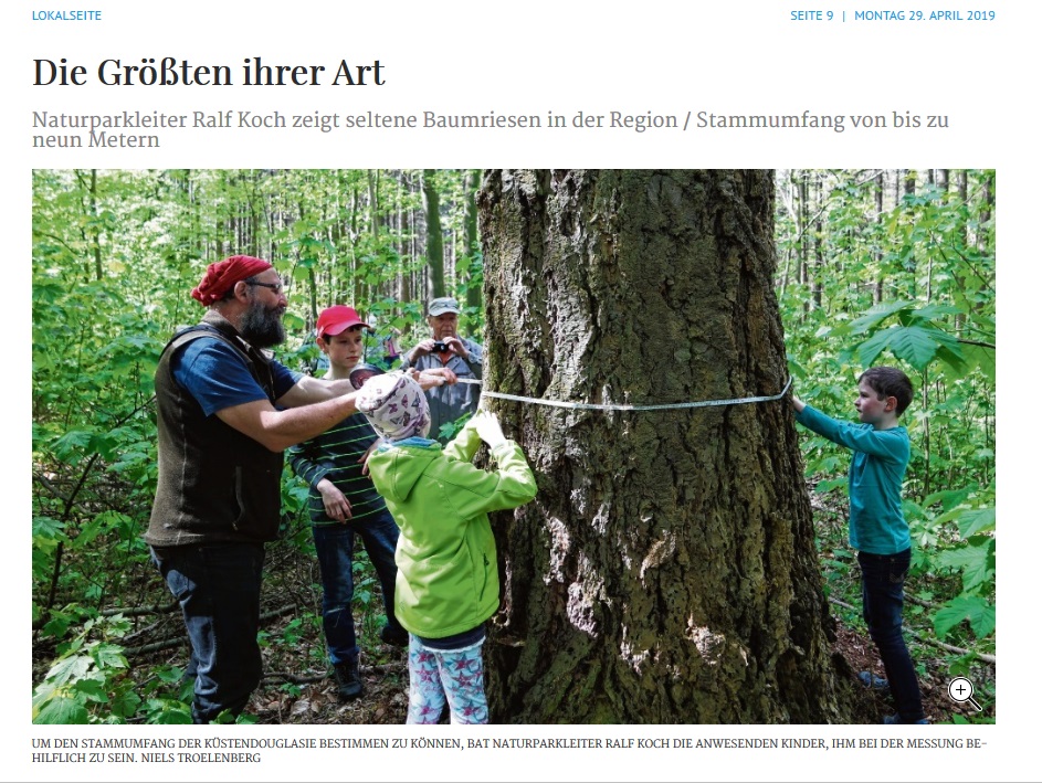 Anschließend fuhr die Gruppe in Richtung Norden. Dort befinden sich in einen Wald bei Kläden 18 Küstendouglasien, die in L-Form gepflanzt worden sind. Der Naturparkleiter erklärte, dass die Art um 1850 von der Westküste Nordamerikas nach Europa gekommen ist, um die 60 Meter hoch und bis zu 1400 Jahre alt wird. Da es sich bei der Küstendouglasie um einen sehr schnell wachsenden Baum handele, sei er holzwirtschaftlich sehr attraktiv. Die Bäume vor Ort stammen wohl aus dem Ende des 19. Jahrhunderts.