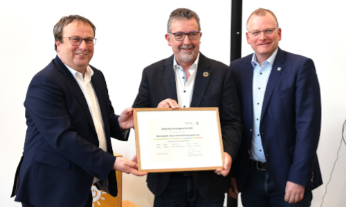 Bernd Fuhrmann (Mitte), Erster Vorsitzender Naturpark Sauerland Rothaargebirge, und Detlef Lins (rechts), Geschäftsführer Naturpark Sauerland Rothaargebirge, nehmen die Urkunde zur Flächenerweiterung Naturpark Sauerland Rothaargebirge von Oliver Krischer, Minister für Umwelt, Naturschutz und Verkehr des Landes Nordrhein-Westfalen entgegen (Foto: Nasser Trabulsi)