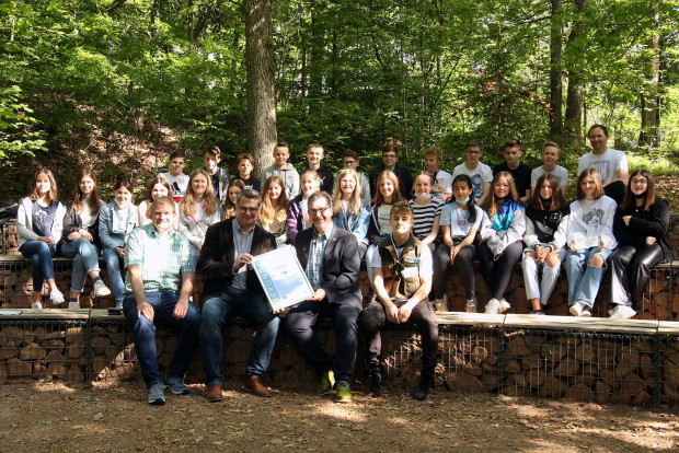 Bei bestem Wetter und unter einem wunderschönen Blätterdach hatten sich am 13.05.22 im „Grünen Klassenzimmer“ am Gymnasium Maria Königin zahlreiche Gäste eingefunden. Hier trafen sich nicht nur die Schülerinnen und Schüler der Klasse 7b zusammen mit ihrem Lehrer Simon Lauterbach, sondern u.a. auch Jan Fabian Borys (Schulleiter), Christoph Tebrügge (stellv. Schulleiter) sowie Bernd Fuhrmann, Detlef Lins und Kerstin Prutti. Grund der Feierlichkeit war die offizielle Auszeichnung des Gymnasium Maria Königin als „Naturpark-Schule“.