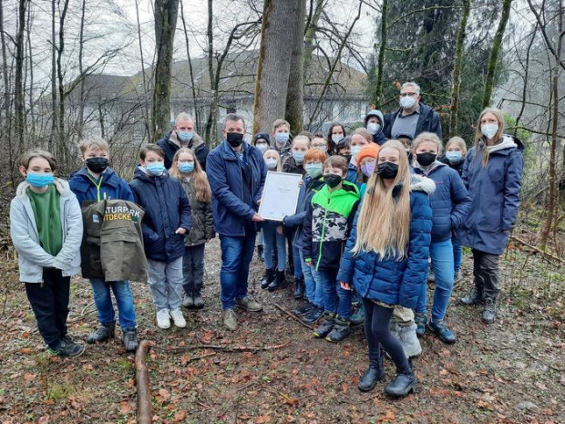 Getreu dem Motto ihres Projektkurses „Friluftsliv“, dem Leben in der freien Natur, empfingen die Fünftklässler die Gäste am 14. März 2022 bei leichtem Regen draußen auf dem Schulgelände. Stolz präsentierten sie hier einige durchgeführte Experimente und Projekte, wie z.B. ein selbstgebauter Wasserfilter aus einer Plastikflasche und Naturmaterialien. Bereits seit vielen Jahren sind Aktionen in und mit der Natur in den Schulalltag integriert. Beispielhaft sind die Keppels Früchtchen (Schülergenossenschaft zur Produktion und zum Verkauf von Apfelsaft), die Arbeit im Naturlehrgarten oder Pflegeinsätze im Naturschutzgebiet Loher Tal, anzuführen. „Man sieht, dass ihr mit Spaß dabei seid, die Natur rund um die Schule zu entdecken. Die Schule zur Naturpark-Schule zu ernennen, sei daher die richtige Wahl“, formulierte Bernd Fuhrmann, Vorsitzender des Naturparks, der anschließend auch die offizielle Urkunde überreichte. Und damit die Kinder draußen auch mit den erforderlichen Utensilien forschen und Insekten oder Pflanzen bestimmen können gab es zusätzlich noch einen Satz Entdeckerwesten.
