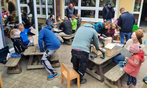 Wo montiere ich einen Nistkasten? Wie reinige ich den Kasten, bevor die Brutsaison losgeht? Und warum wird überhaupt eine künstliche Nisthilfe gebraucht? Diesen und weiteren Fragen wurde zunächst nachgegangen, bevor das große Werkeln begann. Ausgestattet mit Akkuschrauber sowie Hammer bauten kleine und große Handwerker gemeinsam die von der AWO-Werkstatt Netphen-Deuz vorgefertigten Bausätze zusammen. Anschließend wurden die einzelnen Nistkästen noch mit einem bunten Anstrich versehen. Lauter Unikate entstanden, die bereit für den Einzug der Blaumeisen sind.