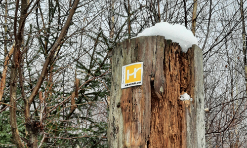 Welch‘ herrlicher Anblick: Das Wegezeichen für den Fernwanderweg „Sauerland-Höhenflug“ getoppt mit Eisblumen (Foto: Naturpark Sauerland Rothaargebirge e.V.)