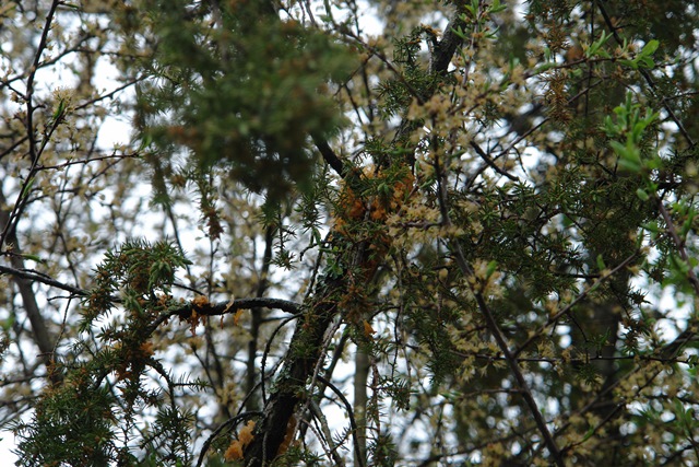 Richtig spannend wurde es bei den letzten drei Punkten der abwechslungsreichen Exkursion: In der Nähe des Vereinsheims des Hundesportvereins wies der Naturparkführer auf einen von ihm so bezeichneten „Zombie- Wacholder“ hin. Der trieb aus Verdickungen am Zweig orangefarbene bis zwei Zentimeter lange Schläuche aus, die ihm ein unheimliches Aussehen gaben. Dank eines anwesenden Gärtners konnte diese Rätsel aber rasch gelöst werden: es handelt sich um eine Form des „Birnengitterrostes“, eines Pilzes der im sogenannten Wirtswechsel einmal Birnbäume befällt und in seiner zweiten Wuchsform eben Wacholdersträucher.