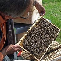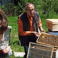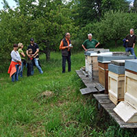 Imker Palmer öffnete einen Stock und erklärte seine Wirkungsweise. Tausende Honigbienen wurden dabei von den Teilnehmern bewundert. Überrascht hat die Friedfertigkeit der Tiere. Niemand wurde gestochen, obwohl alle ganz nahe bei den Bienen waren. Unterwegs zu einer Honigverkostung gab es charakteristische Nektarpflanzen zu sehen, die von Bienen und Hummeln besucht wurden. 2 Sorten Berglener Honig auf Butterbrot ließen sich die Wanderer schmecken.