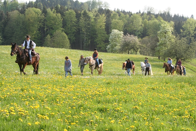 Zu Fuß oder abwechselnd auf dem Rücken der Pferde wandert die Gruppe zu den urzeitlichen „Quarzriesen“ auf den Höhen des Rottals. Von dort aus geht es weiter hinab ins Flusstal der beschaulichen Rot, um dort ein Frühjahrsfeuer zu entfachen und den Tag bei „Äpflpunsch“ und „Gmiassubb“ ausklingen zu lassen.