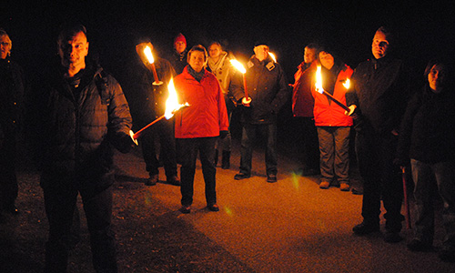 Löwensteiner Bergtour: Auf einer Fackelwanderung mit Naturparkführerin Sabine Rücker durch die Weinberge, mit grandiosen Ausblicken auf Löwenstein und ins Weinsberger Tal, lauschen die Teilnehmer der ein oder anderen alten Sage und Geschichten aus den Löwensteiner Bergen. In Kooperation mit der Stadt Löwenstein.