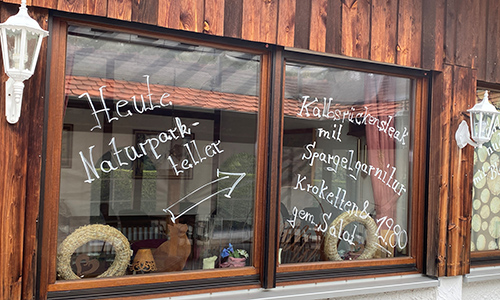 Naturparkteller-Gastronom Armin Haller, selbst aktiv im Gemeinderat, bietet eine abwechslungsreiche regionale Küche und eine große Auswahl saisonaler Speisen und Getränke. Seine Gaststätte verfügt über eine behindertengerechte Toilette. Gasträume und Terrasse sind mit dem Rollstuhl barrierefrei erreichbar.