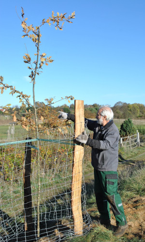 Der Vorsitzende des Heimat- und Kulturvereins Wilfried Tagnatz beim Anbinden der Bäume