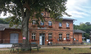 Straße und denkmalgeschützter Bahnhof sind verbunden mit einem Pfad, der barfuß Schritt für Schritt zu erkunden ist. Mehrere Wanderwege und Radpisten kreuzen sich. Unter der Brücke gehen zwei Seen ineinander über.