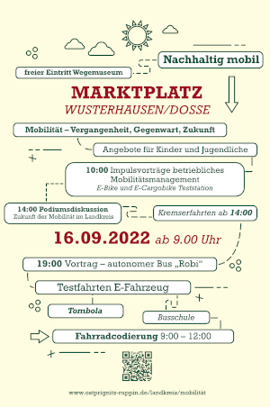 Am 16. September drehte sich in Wusterhausen alles um das Thema Mobilität. Der Landkreis Ostprignitz-Ruppin und die Gemeinde Wusterhausen organisierten zusammen im Rahmen der Europäischen Mobilitätswoche einen ganztägigen Aktionstag auf dem Marktplatz in Wusterhausen, bei dem verschiedenste Mobilitätsformen ausprobiert werden können.