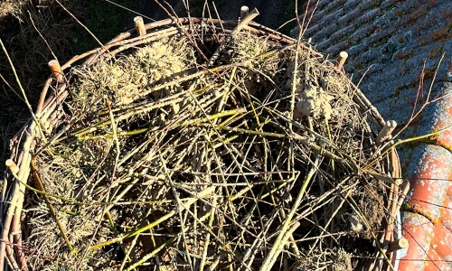 Der Weidenkorb ist angebracht, Grassoden, Kalk-Lehm-Schlämme (getrocknet sieht diese wie eine Hinterlassenschaft anderer Störche aus) und vorbereitete Äste sind im Nest.
