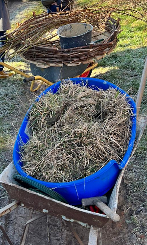 Vorbereitung ist alles. Material und Werkzeug für den bevorstehenden Aufstieg und Einbau. Der Weidenkorb als neues Domizil sowie ein Eimer mit Kalk-Lehm-Schlämme nebst losen Weidenästen (oben) und eine Wanne mit Grassoden (unten).