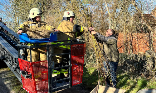 Die Hubleiter trägt neben den fleißigen Feuerwehrmännern auch das ganze Equipment nach oben; so auch lose Weidenäste, die die Störche sofort verbauen können.