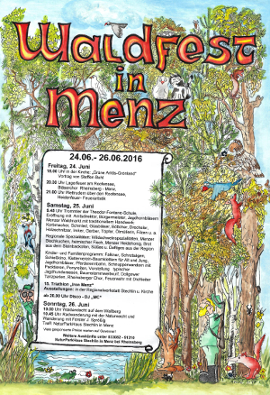 Am Samstag findet ab 10 Uhr der Große Waldmarkt statt. Traditionelles Handwerk mit Töpfer, Imker, Spinner, Korbmacher, Harzer und Schmied sowie heimische Spezialitäten. Wildschwein am Spieß, Fisch aus unseren Gewässern und selbstgebackenem Kuchen. Großes Kinder- und Jugendprogramm mit Wald- und Angelspiel, Basteln, Malen und Raten. Menzer Triathlon „Iron Menz„, ganztägig Kulturprogramm, Kutschfahrten u.a.m.