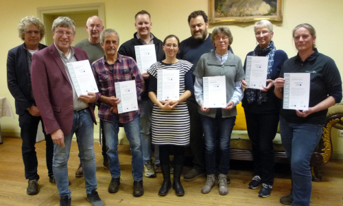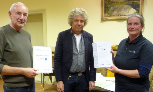 Aus den Händen von Naturparkleiter Dr. Mario Schrumpf und Projektkoordinator Olaf Wolff erhielten sie ihre Urkunden und Plaketten. Letztere sind für die Eingangsbereiche gedacht, um für jedermann die Mitgliedschaft im Partnernetzwerk sichtbar zu machen.