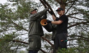 Naturwächter Rüdiger Meyer hängt zusammen mit einem Azubi eine künstliche Bruthöhle für den Wiedehopf auf.