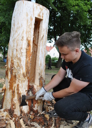 Große Aufmerksamkeit fand auf dem Waldmarkt am Samstag die Vorführung polnischer Zeidler (Waldimker) zum Bau von sogenannten Klotzbeuten aus Baumstämmen für die naturgemäße Bienenhaltung. Dieses historische Waldgewerk wurde erstmalig auf dem Waldfest präsentiert. Ines Alkewitz aus Zernikow hat sich mit dieser Form der Bienenhaltung im Rahmen der Bildung für nachhaltige Entwicklung näher beschäftigt.