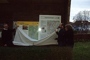 Im Beisein der Presse weihten Andreas Zimmer, Vizepräsident-Kanu-Wandersport und Naturparkleiter Dr. Mario Schrumpf die 129. Infotafel des Wasserwanderleitsystems im Ruppiner Seenland ein. Mehr als 225 T€ flossen seit 2008 in dieses Projekt (LEADER-Fördermittel sowie Haushaltsmittel des Naturparks und zahlreicher Kommunen). Das Wasserwanderleitsystem weist ortsunkundigen Paddlern zwischen Berliner Stadtgrenze und Landesgrenze nach Mecklenburg-Vorpommern den Weg auf mehr als 2.000 km Wasserwegen.