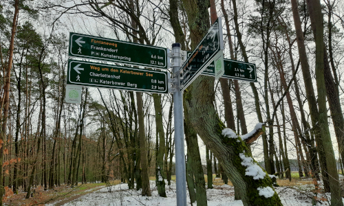 Die ersten Pfosten sind bereits gesetzt und Schilder montiert, wie hier am Schnittpunkt von Fontaneweg und Rundweg um den Katerbower See © Olaf Wolff