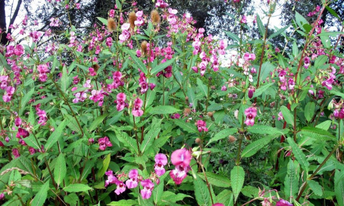 Als hübsche Gartenpflanze, die auch Nektar für Honigbienen produziert, wurde das Springkraut importiert und gelangte von den Gärten in die Natur. An einigen Gewässerläufen im Naturparkraum hat sich diese sehr schön blühende Pflanze zu einer erheblichen Konkurrenz für die heimische Vegetation entwickelt. Aus dumm und illegal entsorgten Gartenabfällen hervorgegangen, konnte sie Lebensräume heimischer Pflanzen derart überwuchern, dass diese keinen Platz mehr zum Überleben haben. Die an heimische Blütenpflanzen häufig sehr spezialisiert gebundenen Insektenarten, haben an solchen Standorten keine Möglichkeit zur Anpassung und sterben aus.