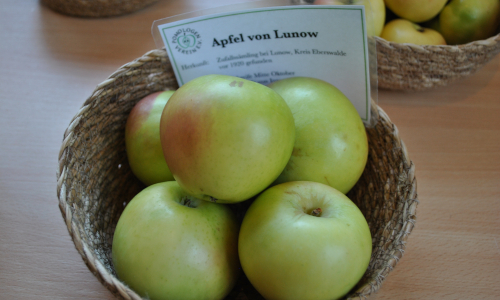 Drei Mitglieder des Pomologischen Vereins Berlin – Brandenburg e.V. bestimmten die Sorten mitgebrachter Apfelproben. Des Weiteren präsentierten sie eine Apfelausstellung mit fast 100 Sorten.