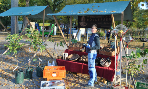 Auf dem vielfältigen Regionalmarkt wurden zahlreiche Produkte rund um die paradiesische Frucht verkauft. Am Stand der Naturwacht konnten Kinder Tragetaschen mit Apfel- und Birnendruckmotiven verschönern.