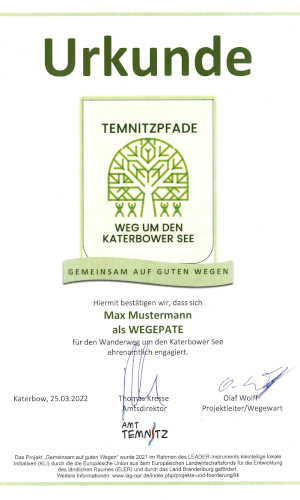 Die ersten ehrenamtlichen Wegepaten für den Wanderweg um den Katerbower See erhielten ihre Berufungsurkunden vom Amtsdirektor Thomas Kresse und Wegewart Olaf Wolff.