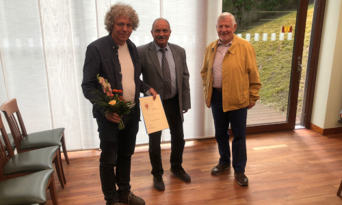 Dr. Mario Schrumpf wurde im Juni mit der Ehrennadel in Silber des Brandenburgischen Wandersport- und Bergsteiger-Verbandes e.V. ausgezeichnet. Präsident Bernhard Laws und Landeswegewart Bringfried Werk übergaben die höchste Auszeichnung des Verbandes in der Vertretung des Landes Brandenburg beim Bund in Berlin.