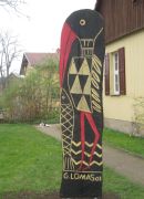 Seit 2003 ist sie zum Symbol der Internationalen Kunstsymposien im Naturpark geworden. Jetzt wurde sie durch Gudrun + Kuno Lomas aus Klein Mutz saniert. Seit mehr als 10 Jahren steht ihr aus massiver Eiche gefertigtes Kunstwerk vor dem Besucherzentrum des Naturparks in Menz. Im letzten Winter faulte der Fuß über dem Erdboden durch. Die Stele mußte umgelegt werden. Die Zehdenicker Schlosserei NIBO hat nunmehr eine Konstruktion aus Edelstahl, eingegossen in ein Betonfundament, gefertigt und die Stele neu aufgestellt.