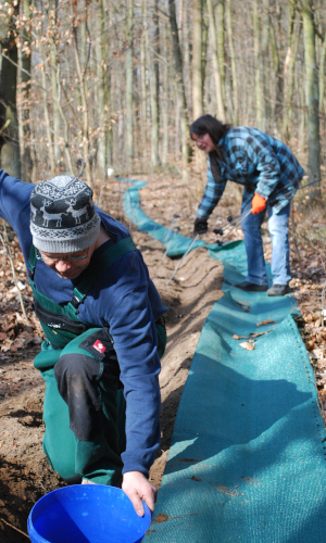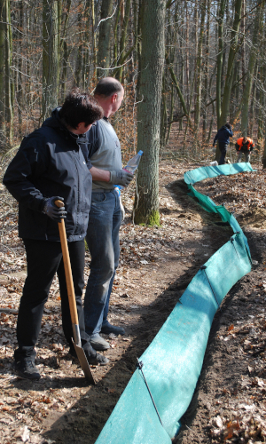 Dann muss alles schnell gehen, der Amphibienzaun wird gebaut und die tägliche Leerung der Eimer organisiert.