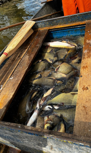 Im Großen Dölchsee wurden überwiegend große Bleie entnommen. Alle gefangenen Fische werden zu Fischbouletten verarbeitet.