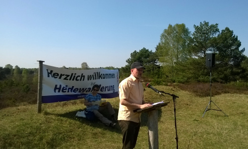 Bei sommerlichem Wetter wanderten die Teilnehmer vom Parkplatz Pfalzheim bis zum Sielmann-Hügel. Dort begrüßten Landrat Ralf Reinhardt und Dr. Matthias Wichmann von der Sielmann-Stiftung die Wanderer. Die Rägeliner Landfrauen, die Fontane-Therme Neuruppin, die Rheinsberger Preussenquelle sowie weitere Anbieter versorgten die Gäste mit einem Imbiss und Getränken sowie Informationen rund um die Heide.