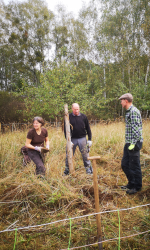 Der zweite Schwerpunkt des Freiwilligeneinsatzes war die Instandsetzung der Streuobstwiese. Als erstes wurde ein Schafszaun um die Wiese gezogen, da in den nächsten Tagen wieder Schafe auf die Fläche kommen sollen, um die Wiese zu beweiden, freizuhalten und die ursprüngliche Nutzung solcher Flächen weiterzuführen. Besonders interessiert und fachkundig ist Marc Maquardt, welcher als Freiwilliger den Einsatz unterstützte. Er stellte nochmal die Bedeutung der Streuobstwiesen als besonderes Biotop für eine Vielzahl an Tieren, besonders Insekten heraus, genauso wie die Erhaltung von alten Obstsorten als wichtige Genressource. Deswegen wurden die drei ausgefallenen Bäume mit neuen ersetzt und bei den vorhandenen, falls erforderlich, Pfähle ausgetauscht.