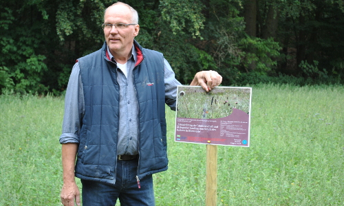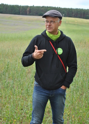 Andreas Bergmann, Vorsitzender des LPV Prignitz-Ruppiner Land e.V., erklärt die Zusammensetzung der Blühmischung für Insekten auf dem Acker am Kalksee.