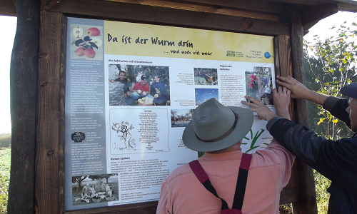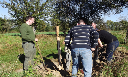 Am Sonntag den 19. Oktober fand der seit längerem geplante Arbeitseinsatz in der alten Apfelallee in Hoppenrade statt. Bereits vor zwei Jahren konnten 30 Apfelbäume im Rahmen des Sortenerhaltungsprogramms des Naturparkes Stechlin-Ruppiner Land gepflanzt werden. Nun sollten auch die letzten fehlenden Bäume, die aufgrund des hohen Alters abgestorben waren oder beim letzten Mal nicht anwuchsen nachgepflanzt werden. Die Bäume stammen aus der Baumschule Fischer in Lichterfelde und wurden vom Naturpark zur Verfügung gestellt. So fanden sich 15 Helfer am Sonntagvormittag am Ortsausgang Hoppenrade ein um die von der GRÜNEN LIGA vorbereitete Aktion zu unterstützen. Das Wetter spielte mit: strahlender Sonnenschein, blauer Oktoberhimmel und angenehme Temperaturen. Die Bahn spielte nicht mit, aufgrund des Bahnstreiks konnten unsere Potsdamer Unterstützer, unter ihnen die Landtagsabgeordnete und Baumpatin Isabelle Vandre (LINKE), nicht nach Hoppenrade kommen. Dennoch begann der Einsatz erfreulich. Pünktlich zum Beginn konnte die Infotafel zum Streuobstprojekt am Beginn der Allee in Hoppenrade fertiggestellt werden. Die von Reta Flütsch (stechlin text&bild) konzipierte Tafel informiert nun Radfahrer, Wanderer oder interessierte Bürger der umliegenden Dörfer über die Geschichte der Allee, die vorhandenen Obstsorten oder über den Apfel an sich und die Artenvielfalt in alten Obstbäumen. „Am Freitag konnten wir die Tafel in Menz abholen und gestern wurde dann von der Firma Poltier der Aufsteller aufgebaut. Eine Punktlandung also,“ so Susann Wähnert vom Apfelhof Hoppenrade, der die Pflanzaktion tatkräftig unterstützt hat und sich auch zukünftig um die Pflege der Bäume in der Allee kümmert um dann in einigen Jahren auch die Äpfel ernten zu können. Bis zum Mittag waren die 20 Pflanzlöcher ausgehoben und die meisten Bäume in den Boden gebracht. Gepflanzt wurden wieder alte, späte Hochstammsorten wie der Bitterfelder Sämling, der neu in der Allee vertreten ist und in mehreren Exemplaren in die Erde gebracht wurde.