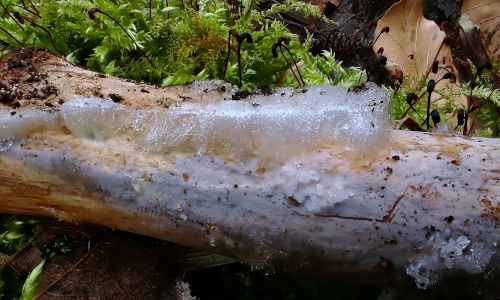Exidiopsis effusa_Rosagetönte Wachskruste mit Haareis (Eiswolle)
