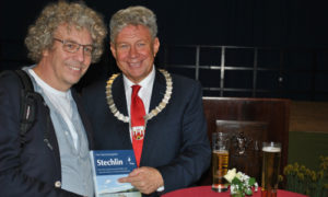 Naturparkleiter Dr. Mario Schrumpf überreicht dem scheidenden Bürgermeister ein Buch über das NSG Stechlin