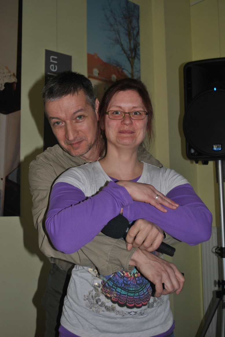 Naturwächter Thomas Hahn und Dorina Hahn (UNB OPR) demonstrierten, wie bei Erdkröten das Männchen vom Weibchen zum Gewässer getragen wird.