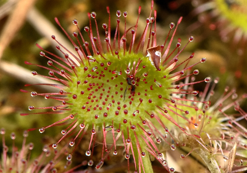 Der bundesweit geschützte rundblättrige Sonnentau ist als fleischfressende Pflanze auf die extremen Bedingungen im Moor spezialisiert. (Foto: Irene Kirchner)