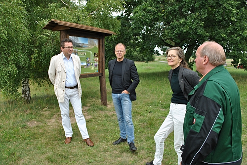 Der Bürgermeister der Stadt Rheinsberg, Jan-Pieter Rau, der Geschäftsführer der Rheinsberger Preussenquelle, Frank Stieldorf, der Leiter des Naturparks Stechlin-Ruppiner Land, Dr. Mario Schrumpf und Zühlens Ortsvertreter Hartmut Schliephacke haben am 27. Juli das Projekt vor Ort der Presse vorgestellt.