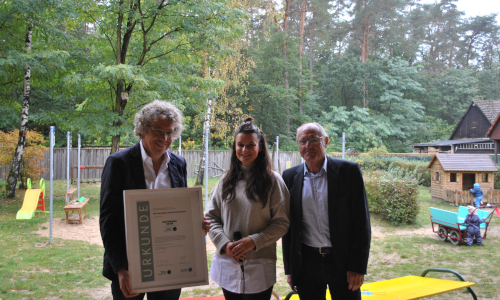 Naturparkleiter Dr. Mario Schrumpf überreicht die Urkunde an Kita-Leiterin Sarah Fischer und den stellvertretenden Amtsdirektor Wolfgang Schwericke.