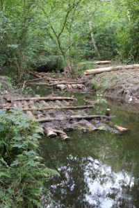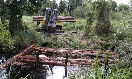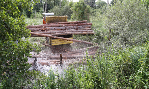 Durch den Einbau von Kiefernholz wird der Querschnitt des Kleinen Rhins verringert und die Fließgeschwindigkeit erhöht.