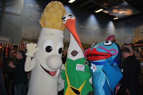 Treffen der Maskotchen: Der Beelitzer Spargel, der NNL-Storch und Wilma Wels von der BUGA Havelland.